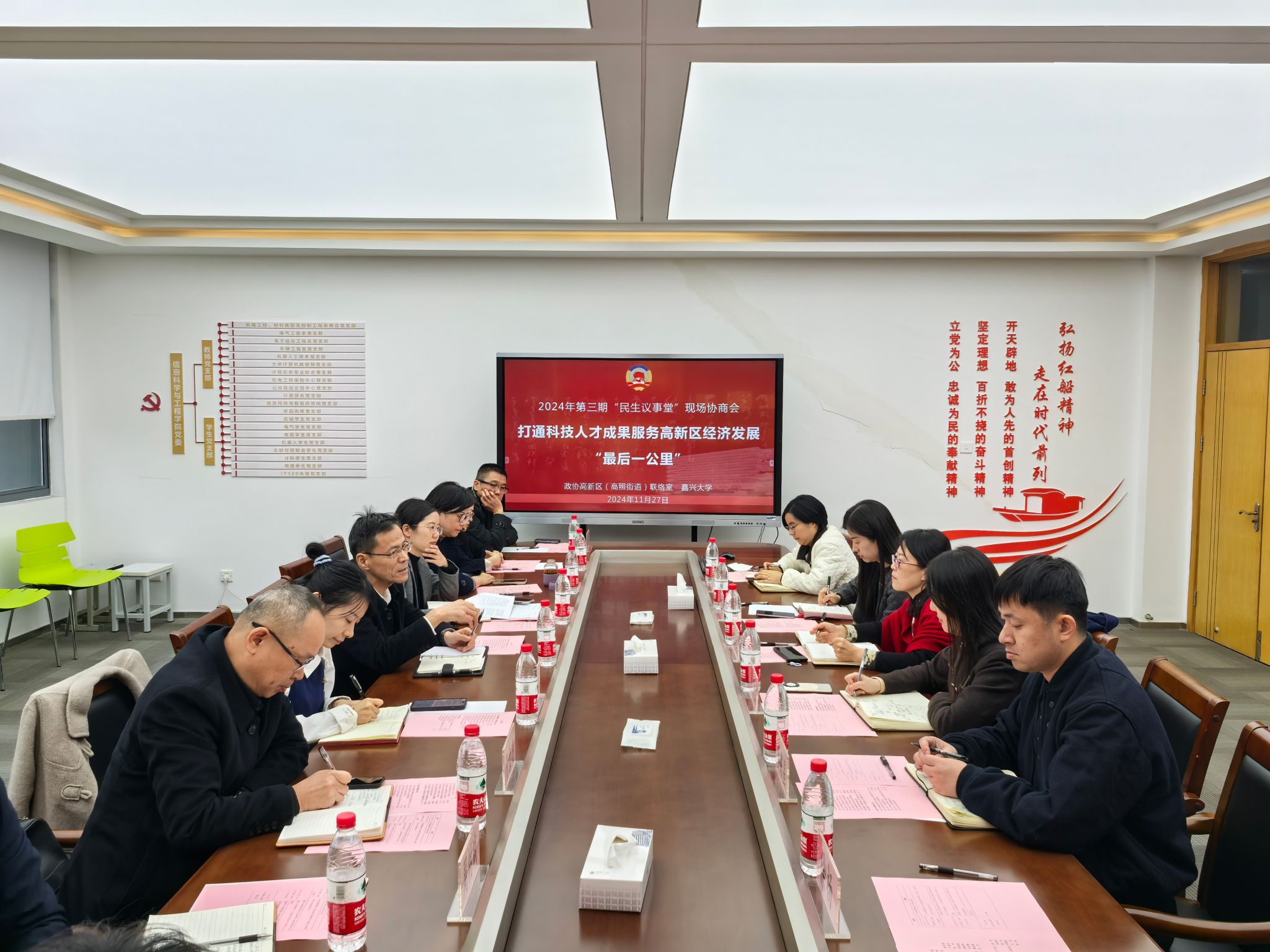 11月27日下午,嘉兴国家高新区党工委副书记冯永福、高照街道党工委副书记姚宏伟带队,政协高新区(高照街道)委员履职小组来校进行调研开展“民生议事堂”现场协商会yl23411永利官网登录党委书记战昕、信息科学与工程公司党总支书记朱奕远、人工智能公司党委书记周钰yl23411永利官网登录党委副书记李寒星、人工智能公司党委副书记凡欣出席会议