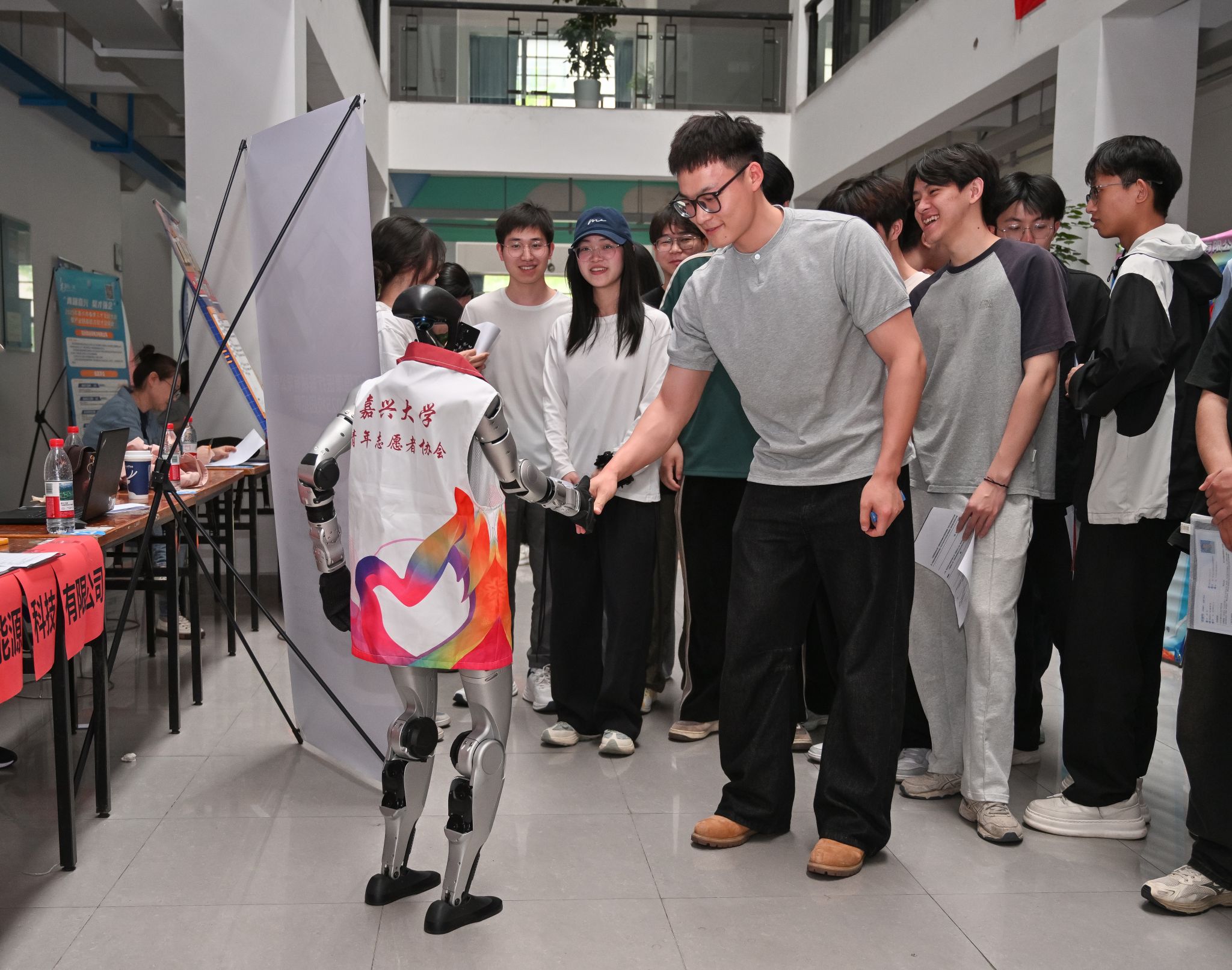 公司领导深入招聘会现场,与用人单位及毕业生亲切交谈,实地调研企业用人需求,与毕业生亲切交流,为求职员工提供精准对接和指导。现场人头攒动,气氛热烈,浙江和炎能源科技有限公司带来的宇树科技人形机器人成为会场一大亮点,为招聘会增添了科技魅力。机器人展示了行走、挥手问候、握手等基本动作,展现出灵活的动态性能。员工们纷纷围上前,或试探性打招呼,或伸手触摸。机器人工程专业的杨同学表示:“这次互动体验让我对智能机器人领域产生了更浓厚的兴趣,也更加明确了自己的职业发展方向。”