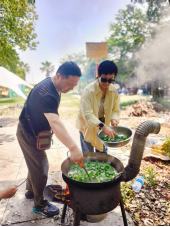 土灶野炊,共品烟火之趣。中午,教职工们转场至户外营地,分组协作制作传统野米饭。从搭土灶、拾柴火到淘米洗菜、生火烹饪,大家分工明确,配合默契。袅袅炊烟中,腊肉、豌豆、春笋等食材在铁锅中翻滚,香气四溢。经过近一小时的忙碌,一锅锅金黄喷香的野米饭新鲜出炉。教职工们围坐一堂,品尝亲手烹饪的美食,畅谈工作与生活,现场氛围温馨融洽。